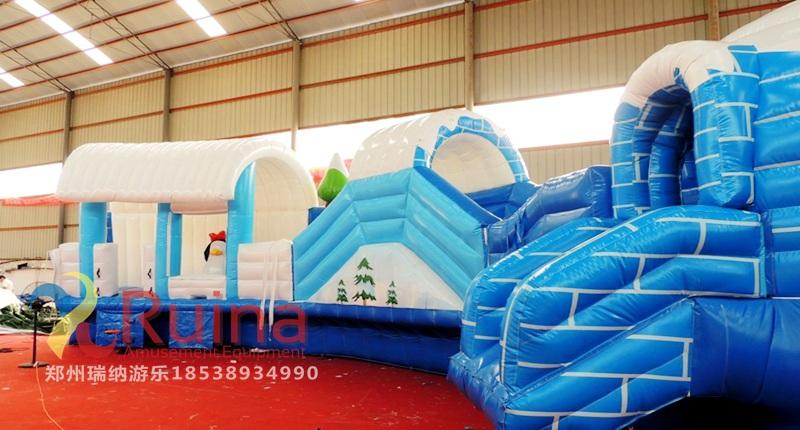 2、環(huán)保材料 冰雪世界充氣城堡用一等環(huán)保夾網(wǎng)PVC為產(chǎn)品原材料進行產(chǎn)品生產(chǎn),無毒、無危、無刺激性,對皮膚不會引起過敏反應(yīng),尤其是小孩子。