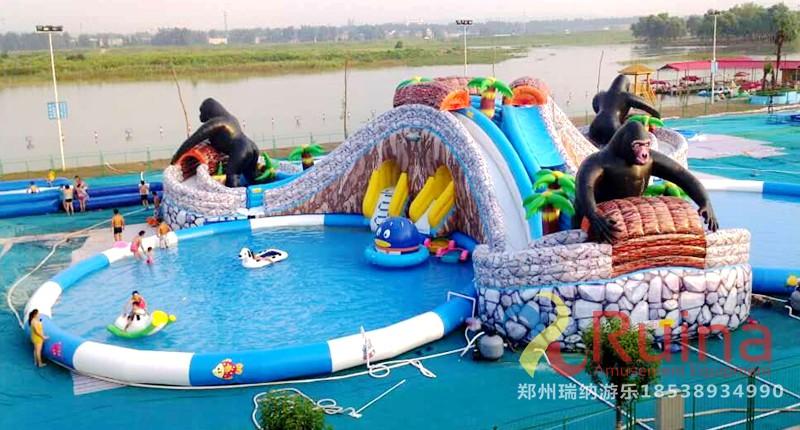 以猩猩林中搬運物品嬉戲為主題,人在林中穿梭,從而達(dá)到人景合一的境界;在設(shè)計結(jié)構(gòu)上是以三個對稱的滑梯組成,加上噴水的效果,給人以視覺上對稱的美感!每個滑梯下面都配有一個充氣水池,水池中放些水上浮具,如香蕉船、水狗、冰山等,讓移動水上樂園的玩法更加豐富。